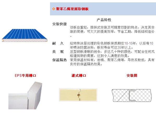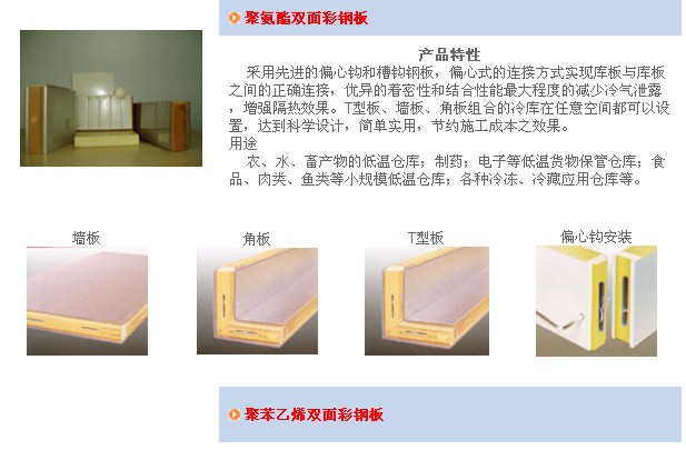 應(yīng)用于組合冷庫上的夾芯板分為兩種類型,分別為聚氨脂夾芯板和聚苯乙烯夾芯板,由于聚氨脂夾芯板的強(qiáng)度、隔熱等性能優(yōu)于聚苯乙烯夾芯板,所以聚氨脂夾芯板通常多應(yīng)用于速凍或庫溫較低的低溫庫上,聚苯乙烯夾芯板則由于隔熱性能較好且價(jià)格適中而通常多應(yīng)用于普通低溫冷庫、高溫冷庫和食品加工廠等工業(yè)與民用建筑上。這兩種夾芯板的綜合性能詳見附圖和附表。由于上述兩種夾芯板所具有的優(yōu)良性能,因此可被廣泛應(yīng)用于工業(yè)與民用建筑的其它各領(lǐng)域。